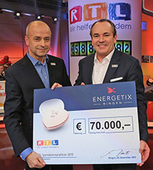 Jessica Schlick (CMO) und Alexander Link (CIO/COO) stiegen ebenfalls aufs Kettcar und ENERGETIX Inhaber und Geschäftsführer Roland Förster freute sich, Moderator Wolfram Kons im RTL-Studio einen Spendenscheck über 70.000 Euro zu überreichen. Insgesamt kamen beim 22. RTL-Spendenmarathon zugunsten Not leidender Kinder über 9 Millionen Euro zusammen.